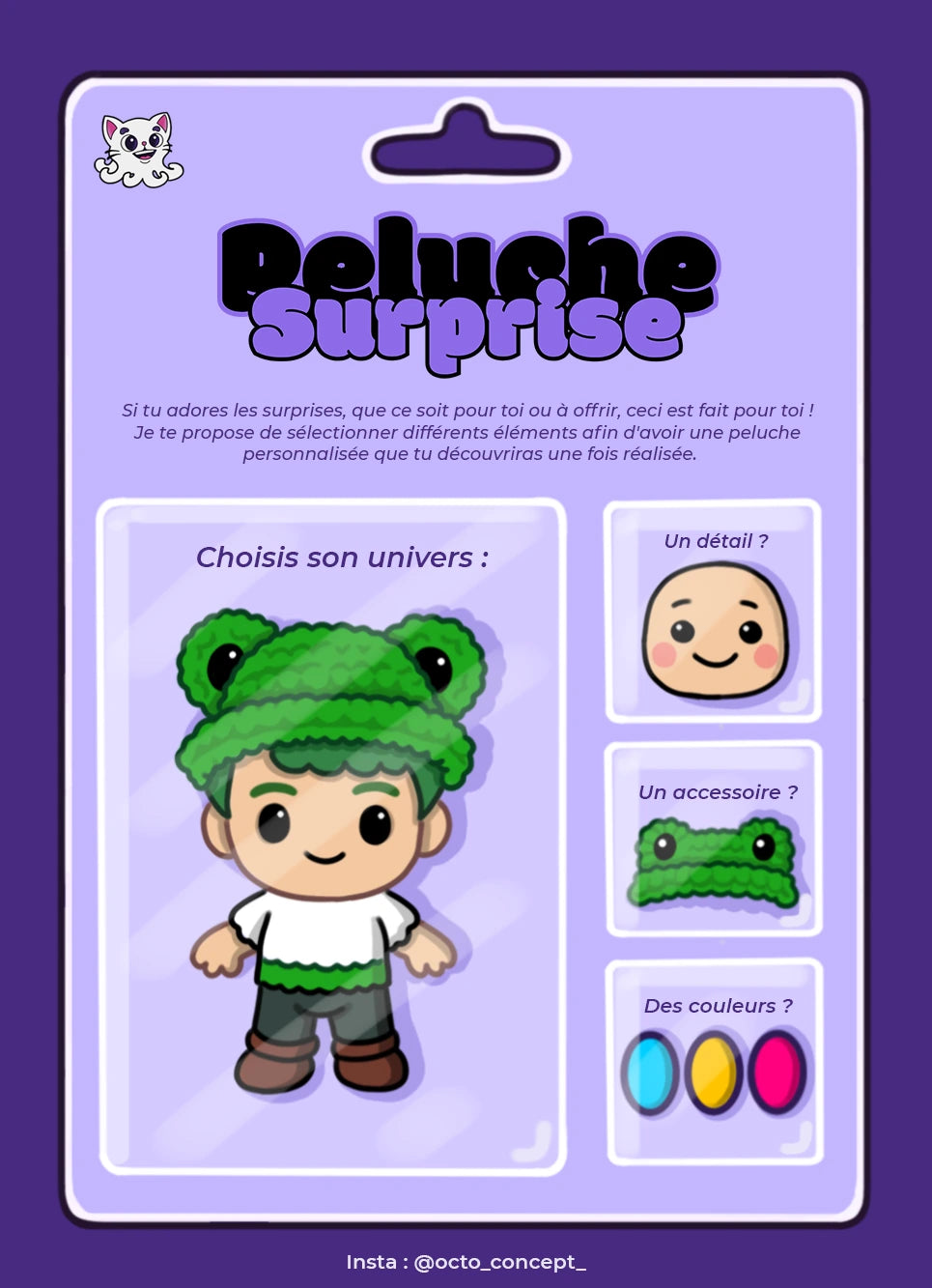 - La Peluche Surprise Octo Concept te propose de remplir un questionnaire de personnalisation : univers geek, couleurs, détails, accessoires... tu choisis tout !