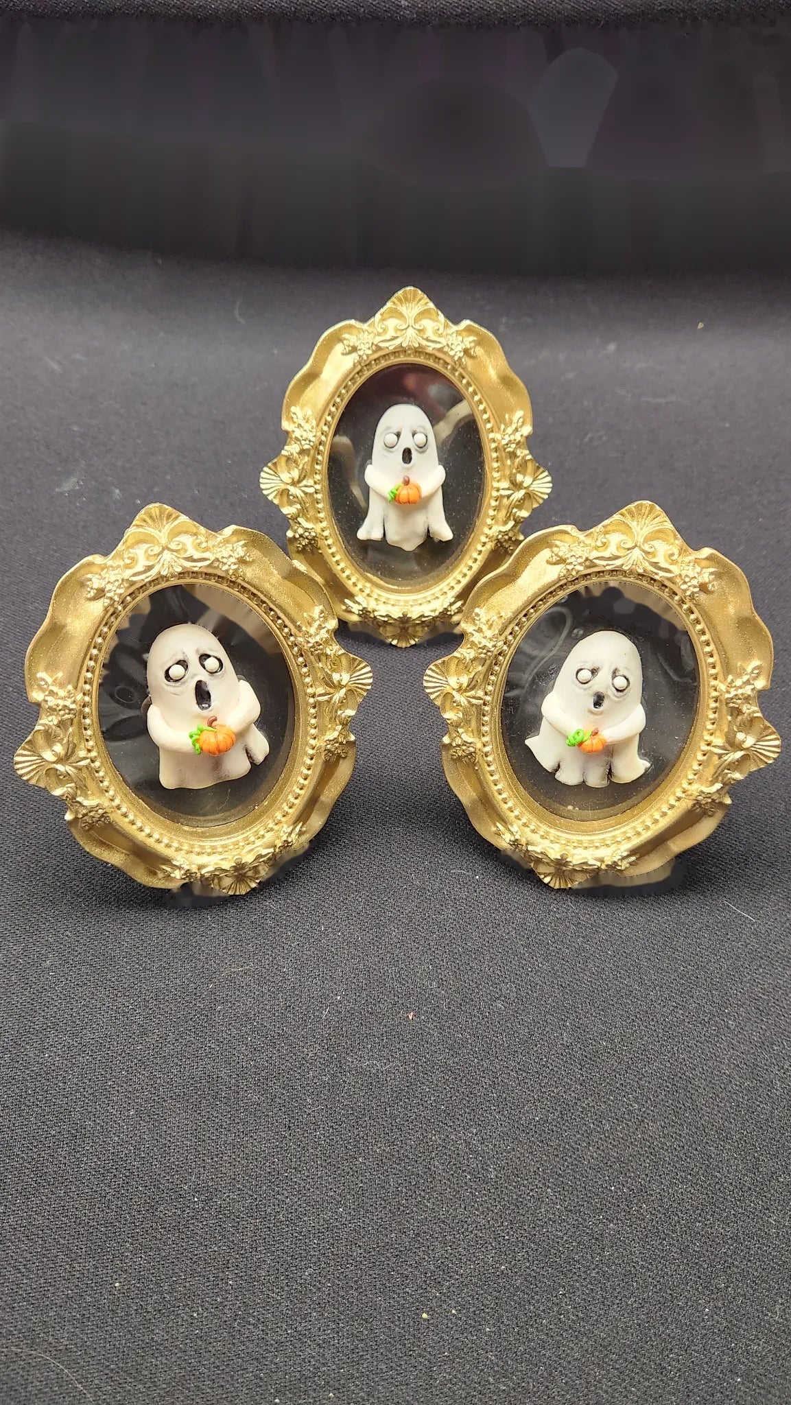 Chaque fantôme est façonné à la main en pâte polymère, peint avec précision et protégé dans son cadre décoratif, ce qui en fait une pièce unique, délicate et pleine de charme.